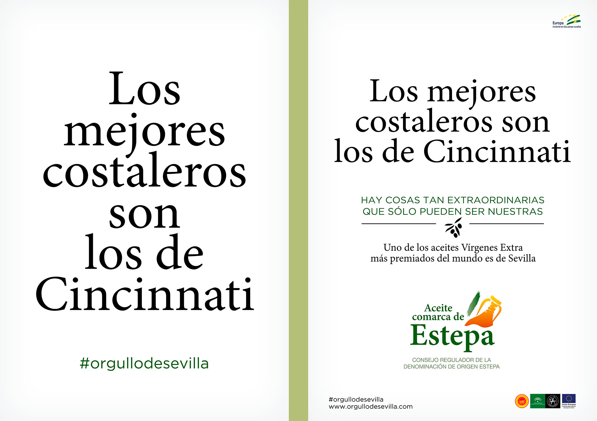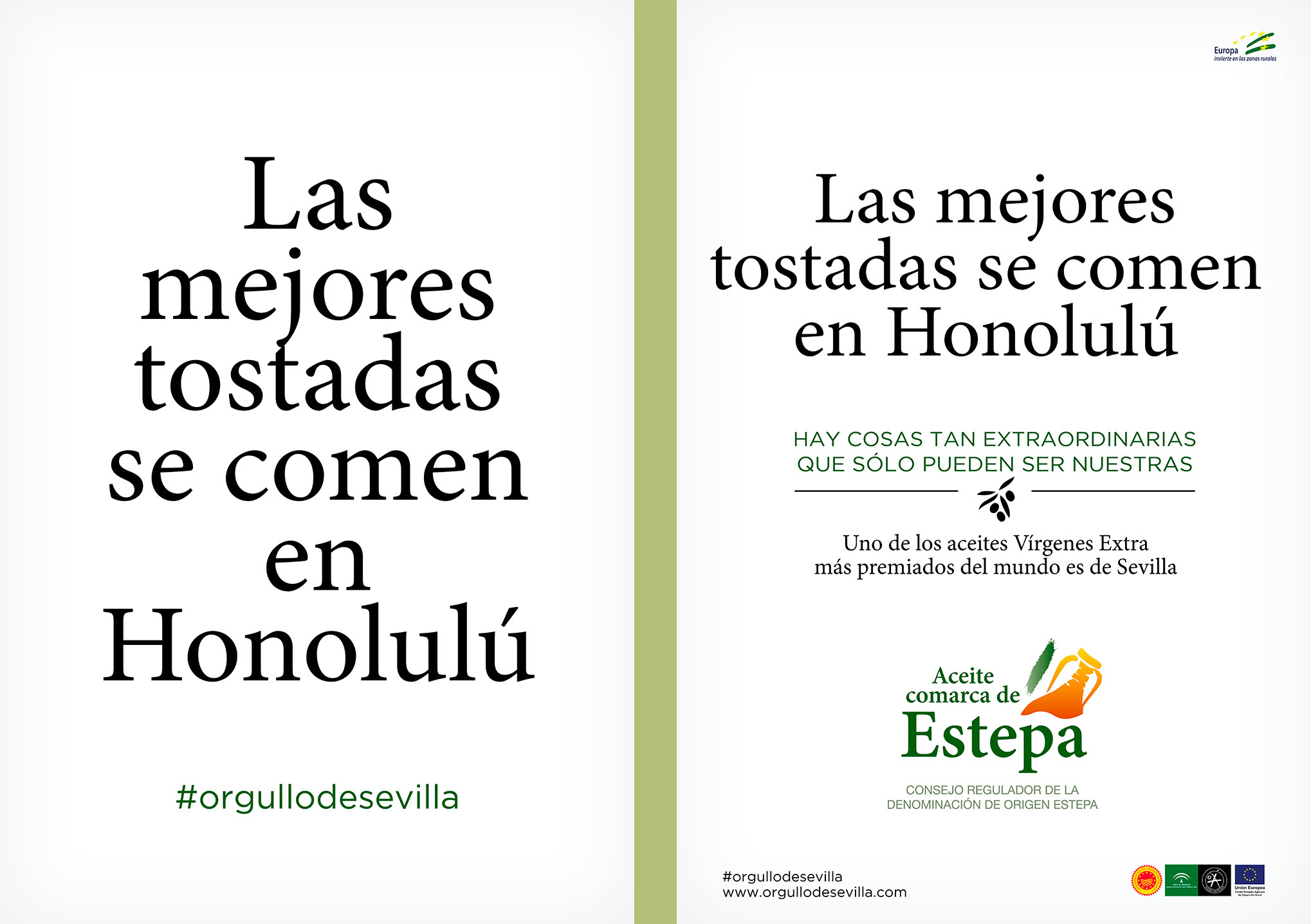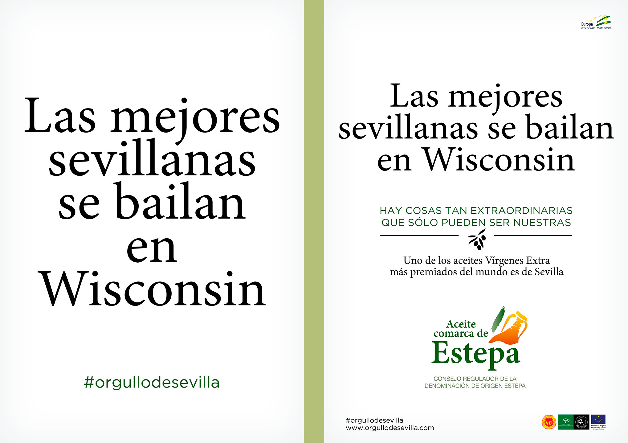 Teníamos que contar que uno de los aceites Vírgenes Extra más premiados del mundo es de Sevilla. Y qué mejor manera que poniendo a prueba el orgullo sevillano. Los titulares de esta campaña juegan al equívoco para luego desvelar la grata sorpresa de que uno de los AOVEs más premiados del mundo también es de Sevilla.