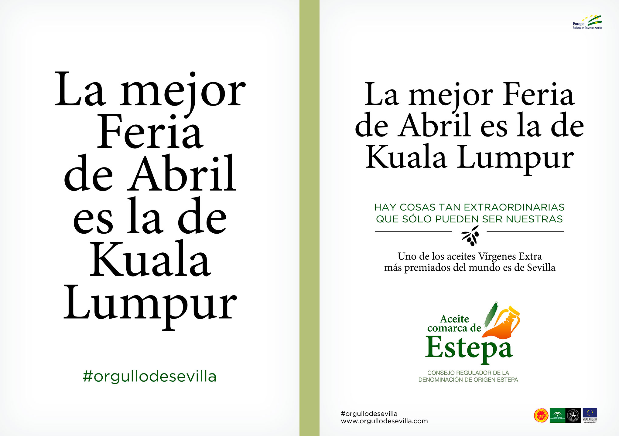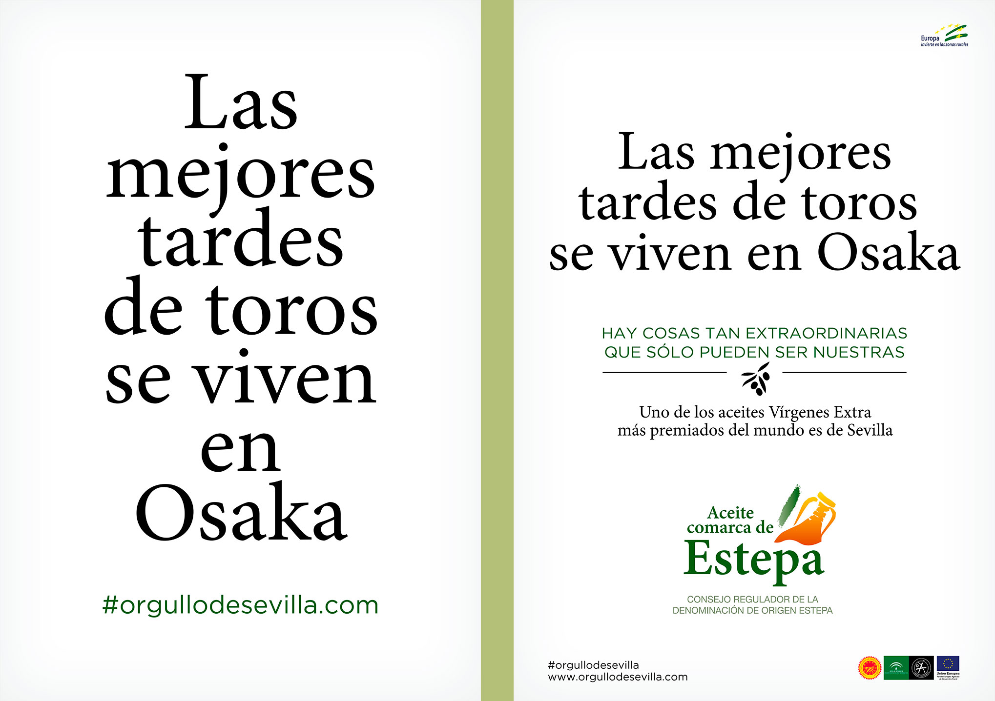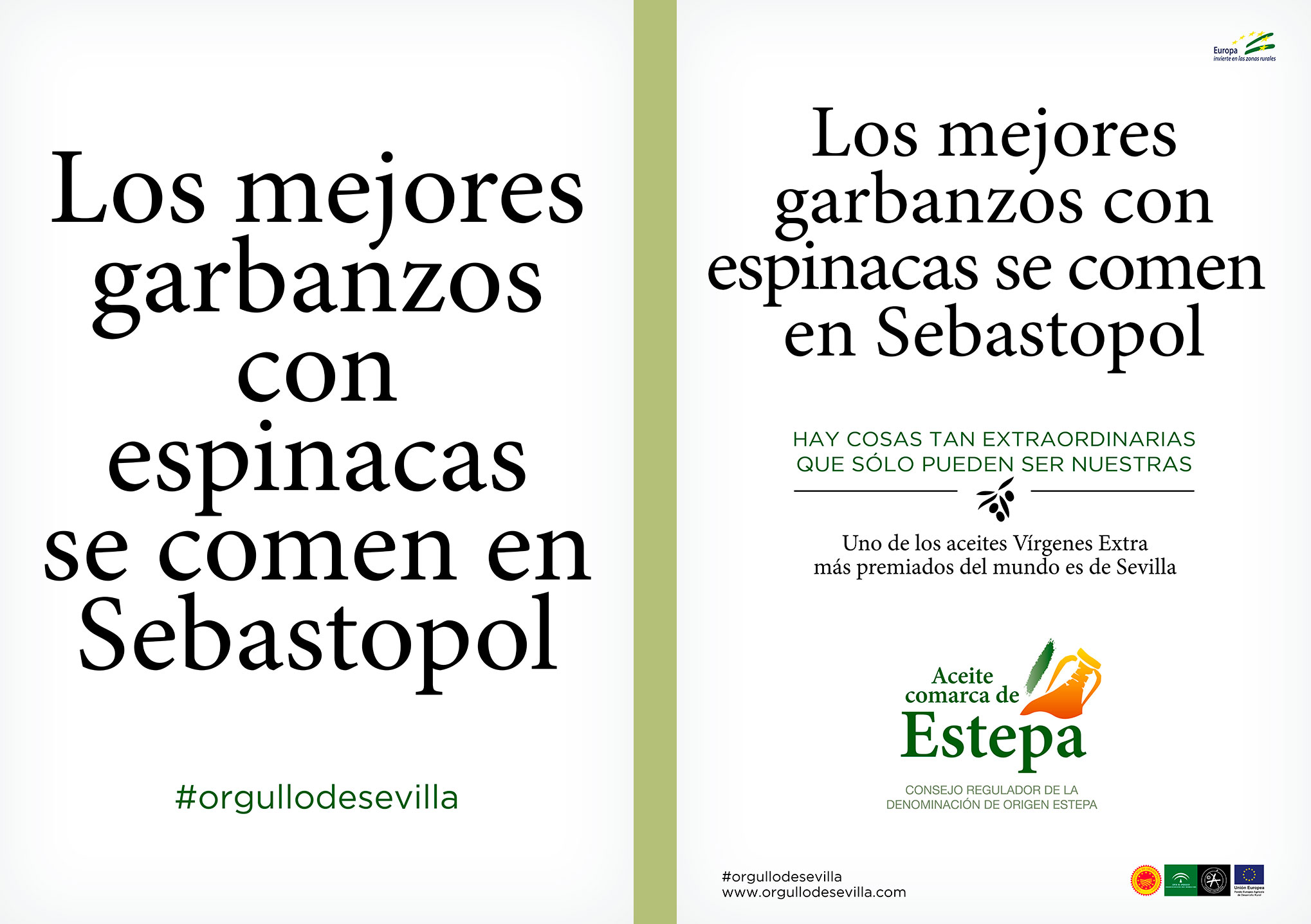 Teníamos que contar que uno de los aceites Vírgenes Extra más premiados del mundo es de Sevilla. Y qué mejor manera que poniendo a prueba el orgullo sevillano. Los titulares de esta campaña juegan al equívoco para luego desvelar la grata sorpresa de que uno de los AOVEs más premiados del mundo también es de Sevilla.