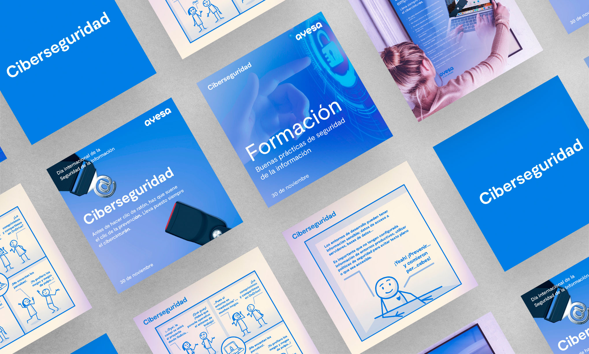 Para fomentar las buenas prácticas de seguridad de la información, Tiovivo ha creado y diseñado diferentes acciones del plan de comunicación interno de Ciberseguridad de Ayesa. Empezando por la identidad visual, se han desarrollado el material de cartelería, salvapantallas, animaciones, digital, RRSS y el diseño de una serie de Tiras Cómicas Digitales Comics para prevenir malas prácticas. Antes de hacer clic de ratón, ponte el Cibercinturón.