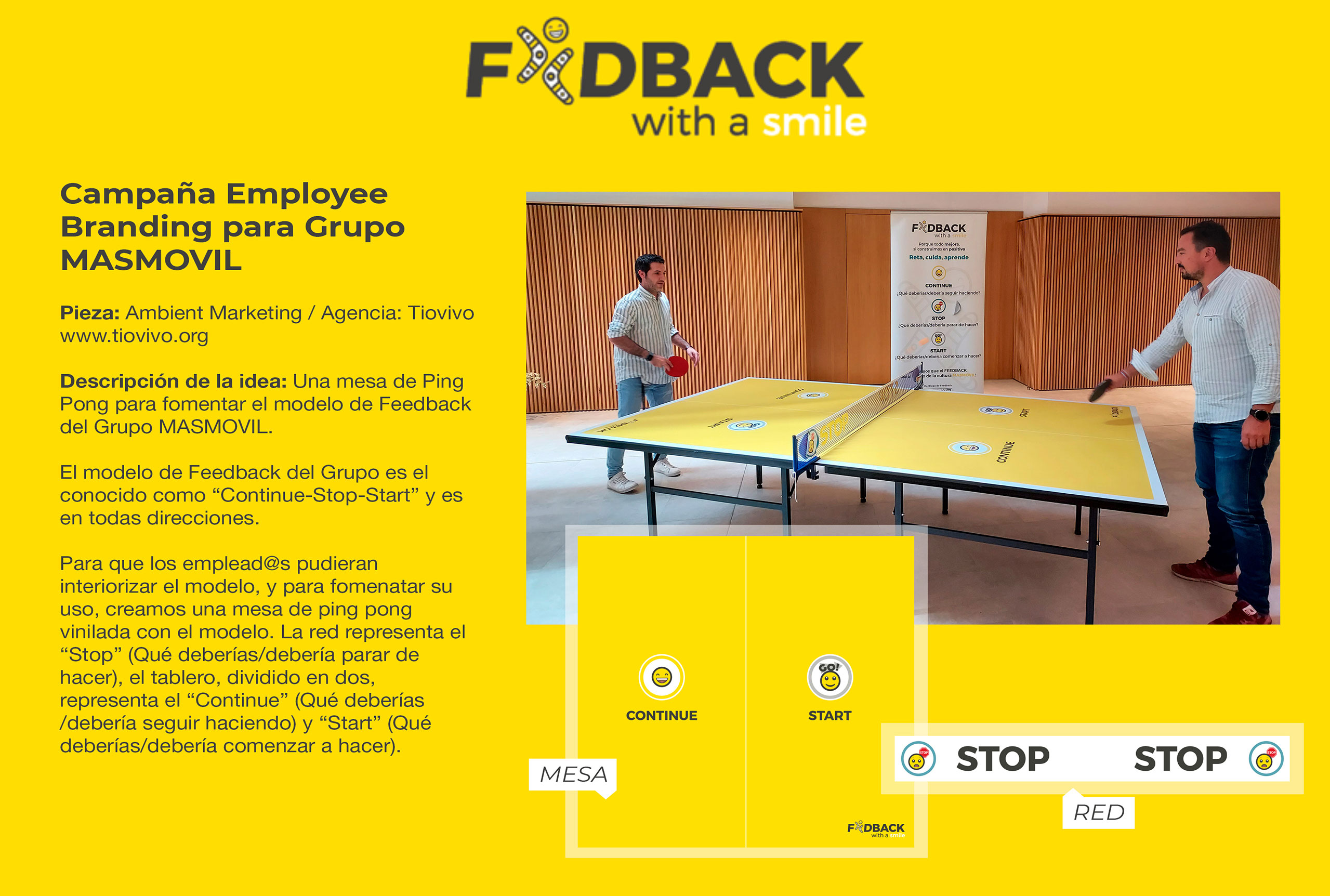 «Continue, Stot-Start»: la red representa el «Stop» (Qué deberías parar de hacer), el tablero, dividido en dos, representa el «Continue» (Qué deberías seguir haciendo) y el «Start» ( ̈Qué deberías comenzar a hacer). La campaña incluía branding, teaser, animaciones, guías, gamificaciones, salvapantallas, emailing, etc. Tiovivo, la agencia de publicidad de Sevilla que hace emotional branding.